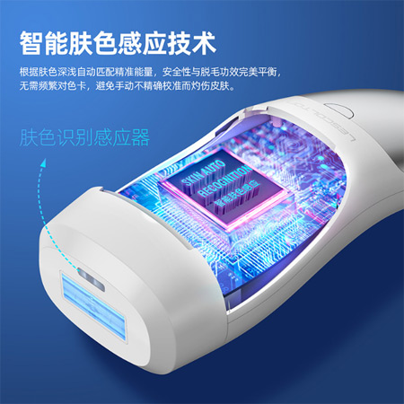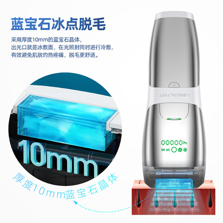 蓝宝石冰点脱毛,采用厚度10mm的蓝宝石晶体,出光口就是冰敷面,在光照射同时进行冷敷,有效避免肌肤灼热疼痛,给用户一个放心,脱毛更舒适。智能肤色感应技术,根据肤色深浅自动匹配准确能量,配色准确更不易灼伤皮肤,减少伤害。